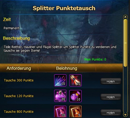 2. ?bersch?ssige Fl?gel, Reittier und andere Splitter k?nnen geteilt werden um Punkte zu erhalten und diese k?nnen dann in Items umgetauscht werden.